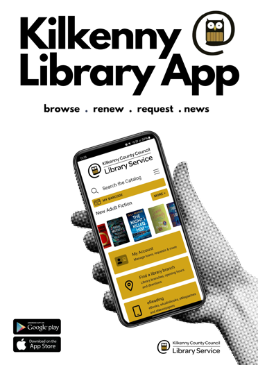 Kilkenny Library APP is free, download it to your phone or tablet from the Apple App Store or the Google Play Store. You will need you library card and pin to get started.
