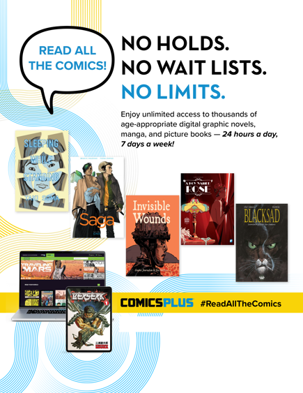 With Comics Plus, you can borrow thousands of free eComics and graphic novels from your library. All you need is a library card and PIN. Access through your browser, or download the Library Pass app.